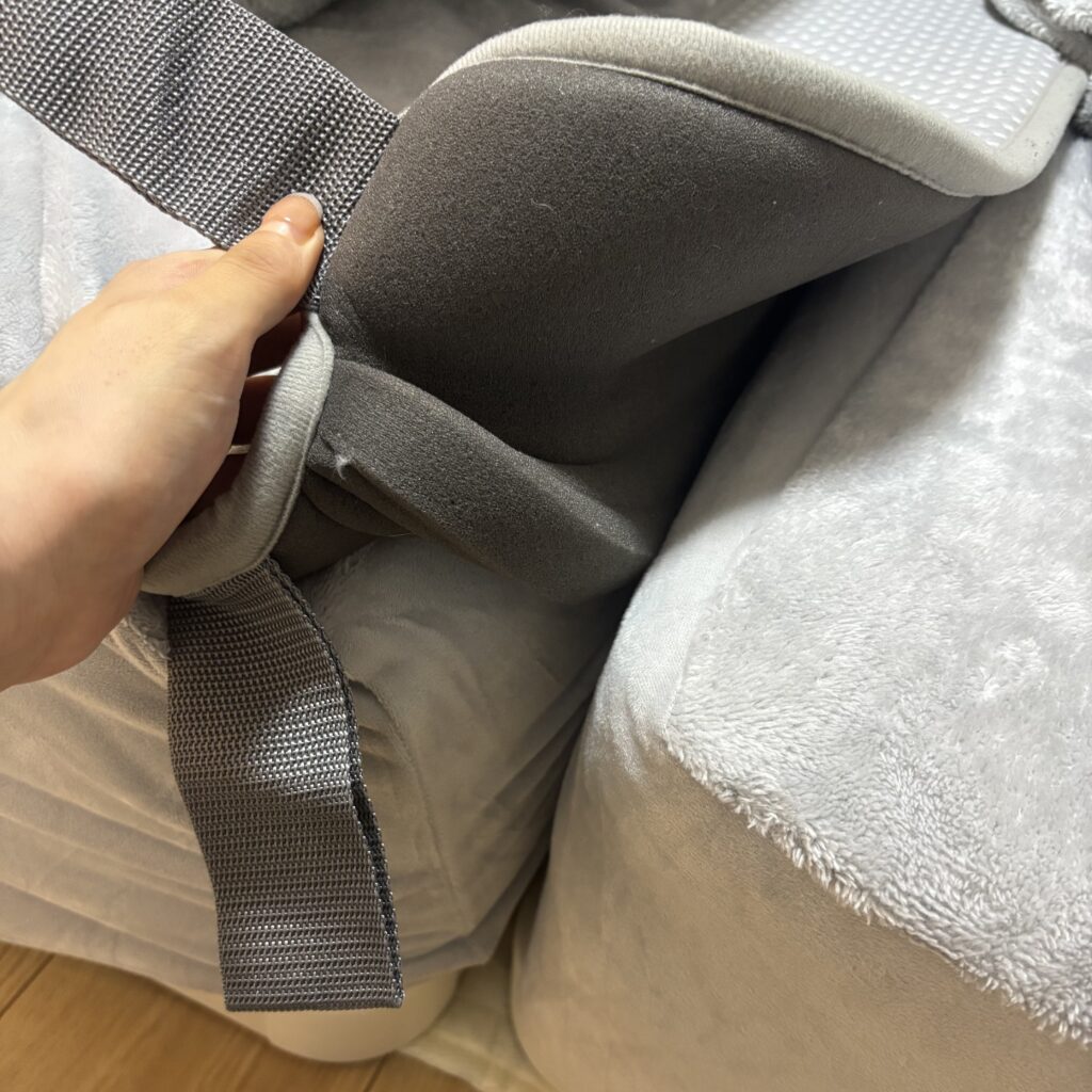 隙間パッドがズレないように、中央にスポンジの突起があり、ベッドフレームごと止めることができるベルトも付いています!(我が家は取り外しがちょっと面倒だったので使っていませんが笑、ズレることはありません)